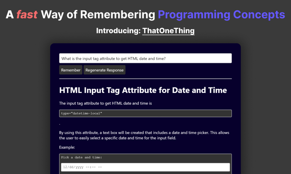 ThatOneThing is a desktop application powered by AI to help programmers remember that one thing they forgot. For example, that one HTML input tag for date, or what are the different types of loops in python, etc. The AI is trained specifically for programming and works best for JS, Python, HTML, C, C++, Java, Kotlin, but is not limited to just these programming languages.